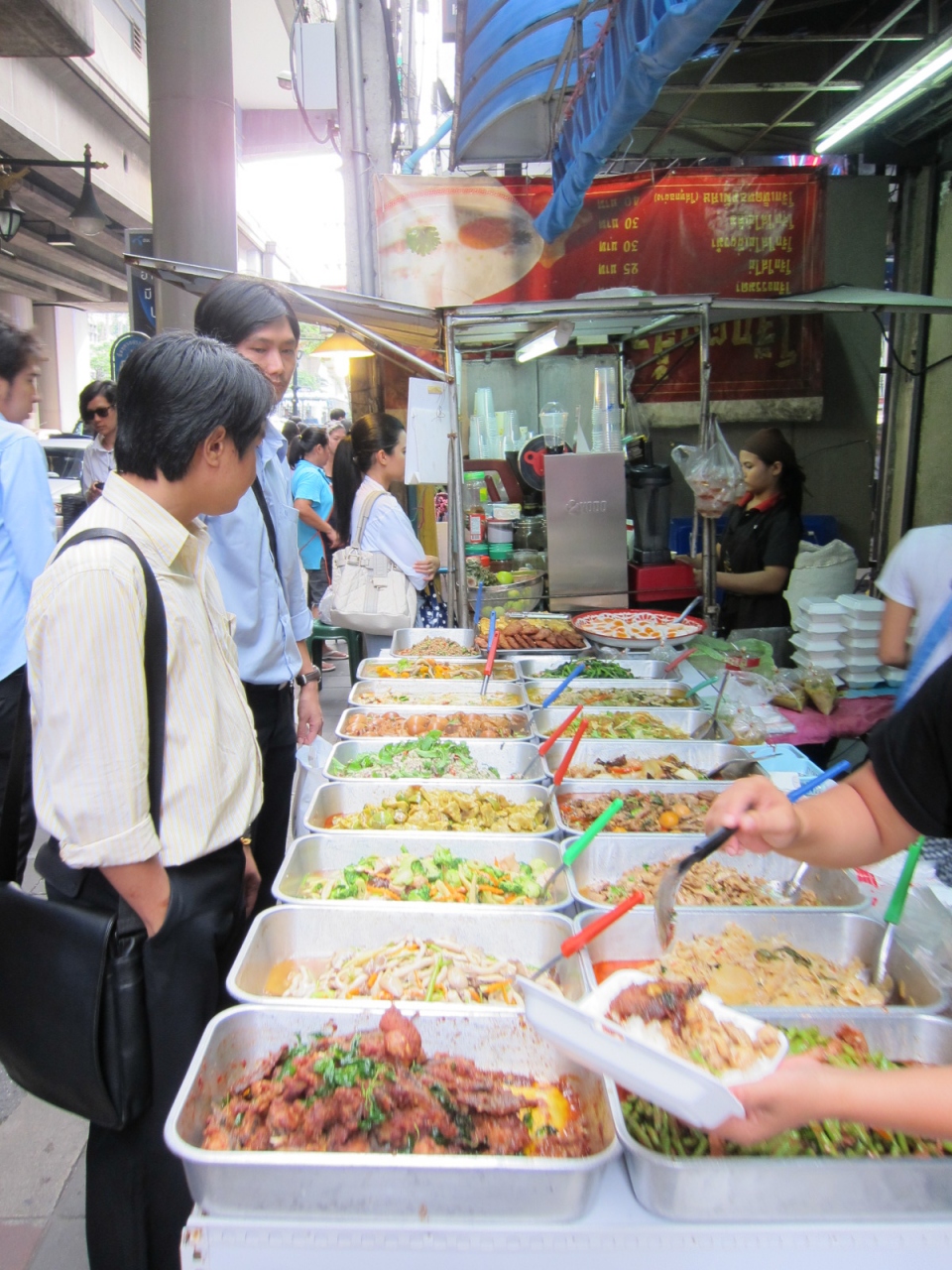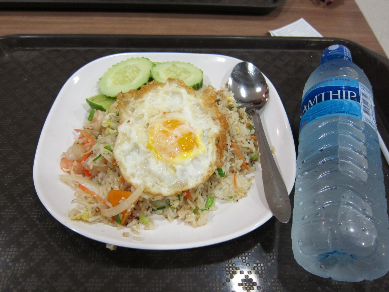 いろんなスーパーにはフードコートがあります。そのフードコートでは1食大体300円以下で食べられ、たいていのタイ料理はカバーしてます。カオマンガイ・カオパット・グリーンカレー大抵の物は食べられます。最初にコート内のデスクでカードを買います。そこにお金をいれ、各店舗でほしいものを買ったときにこのカードを渡すと、中に入っていたお金からひかれていきます。最後はカードを買ったところに持っていくとお釣りをくれます。チャーハン・カオパットとかはその場で作ってくれて、アツアツを食べることができるのでおいしーですよ。