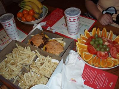 in&outバーガーは冷凍食品を使わない、注文があってから調理するおいしーハンバーガー屋さんです。ポテトですら冷凍を使ってないので、揚げたてホクホクが食べられます。普通のハンバーガー屋さんと違い、お店の中で食べることができませんが、ドライブスルーのみのお店になります。メニューもハンバーガーとチーズバーガーのみですが、裏メニューとやらがあります。お店の人にいうと、2・3教えてくれます。私はポテトにチリソースとチーズの乗ったものを教えてもらいました。名前は忘れましたが、裏メニューも頼んでみてください。