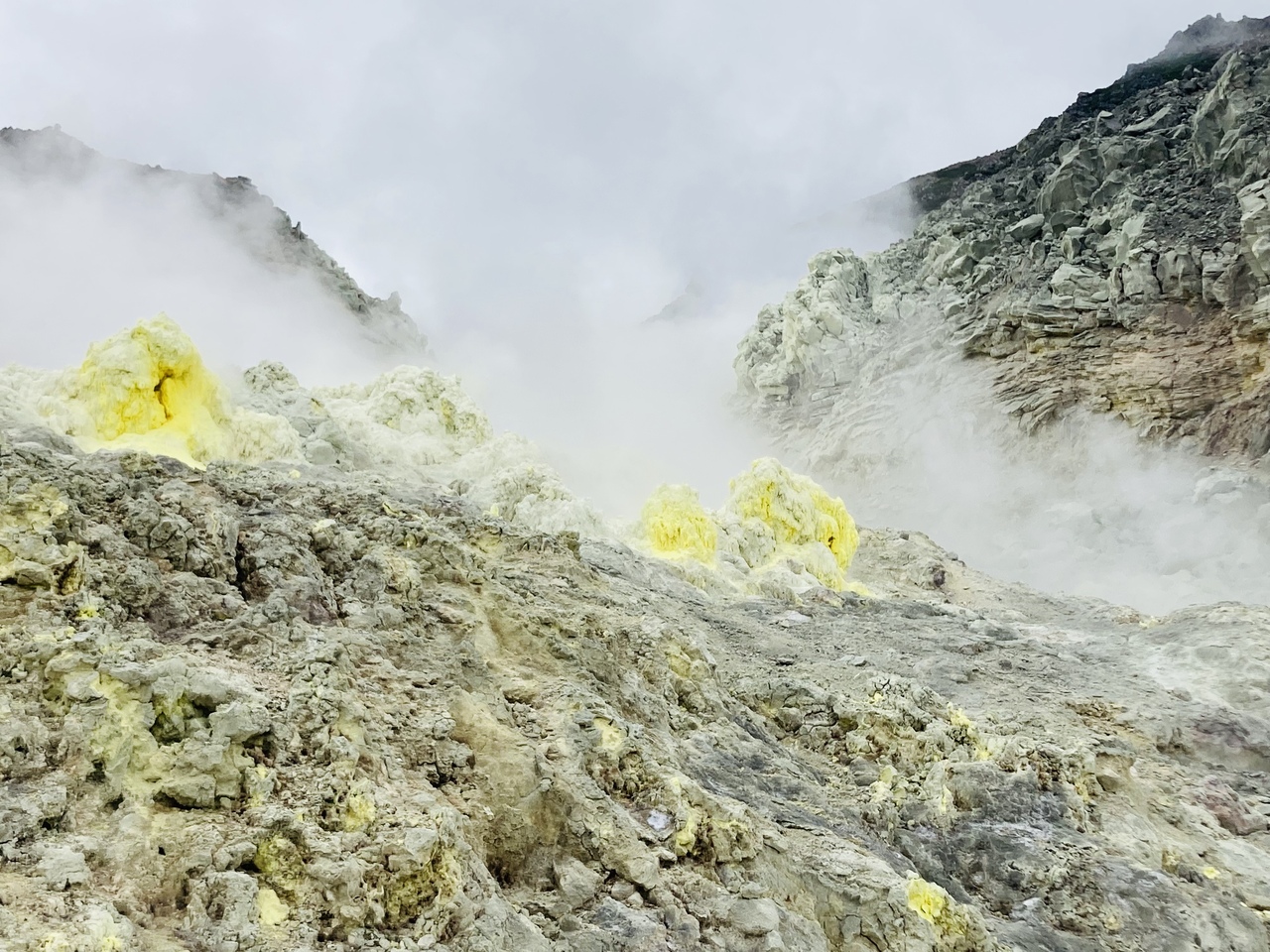 硫黄山のふもとにある売店。ソフトクリームやいもだんごなどスナックフードが充実していますが、名物はなんといっても温泉蒸したまご。硫黄山から噴き出る蒸気で蒸したシンプル極まりない料理ですが、なぜかとてもうまい。