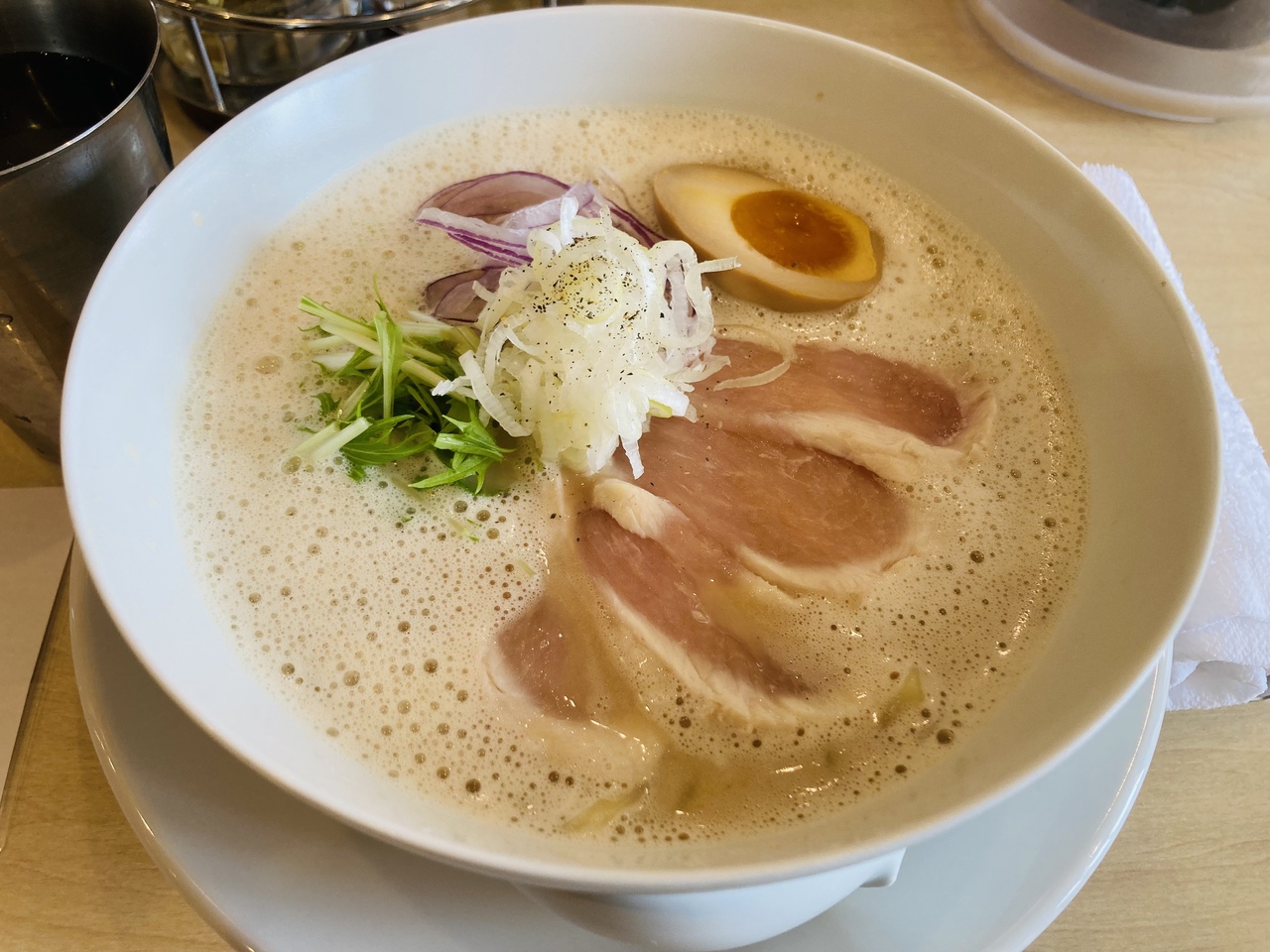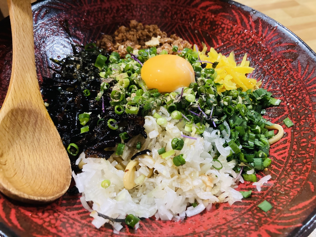 まぜそばは太麺に揚げた海苔、タクワン、生ニラ、挽肉、生卵がのっており、グシャグシャに混ぜて食べます。お好みで特製ラー油も。味は濃いめで身体に悪そうですが箸が止まりません。麺を食べ終わり残った具に追いメシ(白いご飯)を投入。これがまた旨い!これにお茶漬けの出汁をかけて頂くこともできます。