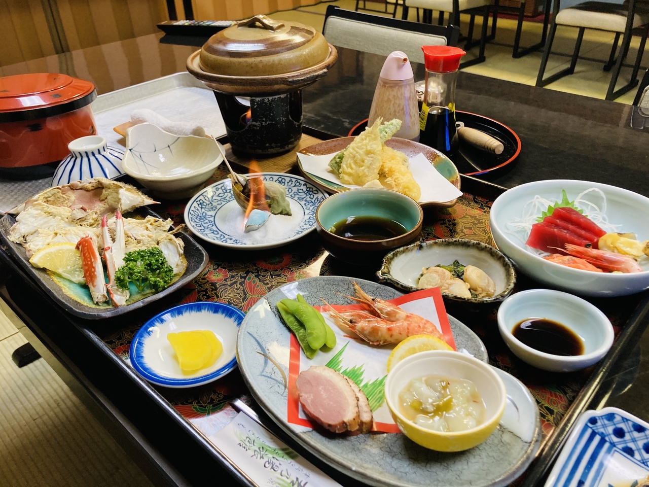 ただし夕ご飯は最高でした。鍋でイカの煮物、つぶ焼き、刺身、煮魚、味噌たっぷりのワタリガニと日本酒が最高でした。- 旅行時期