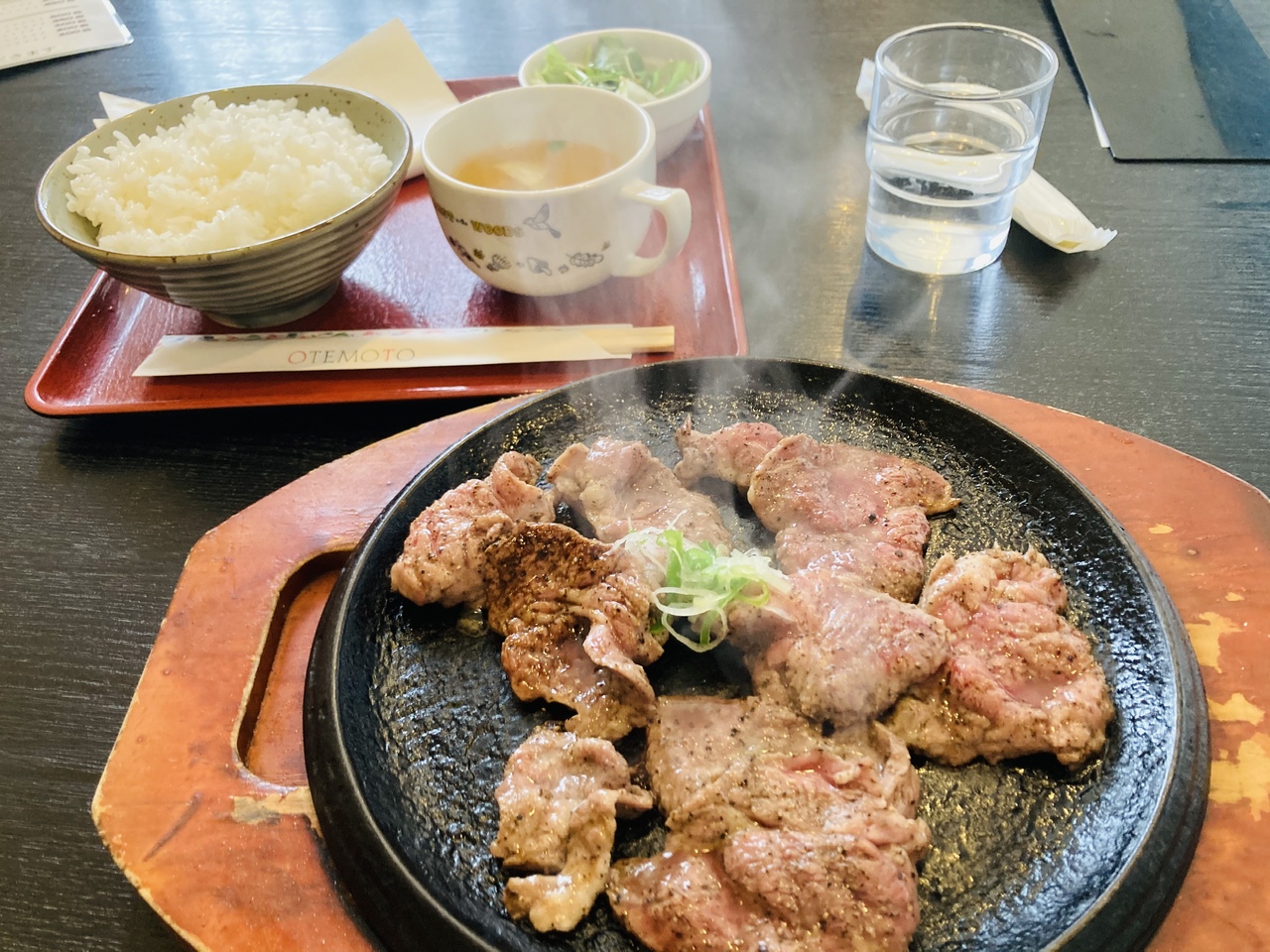 今回は「ステーキ風サフォーク150g」を注文しましたが、これが大正解!熱々鉄板にジュー、という音と共に運ばれてきたお目当てのサフォーク。焼き加減はミディアムといった感じか。