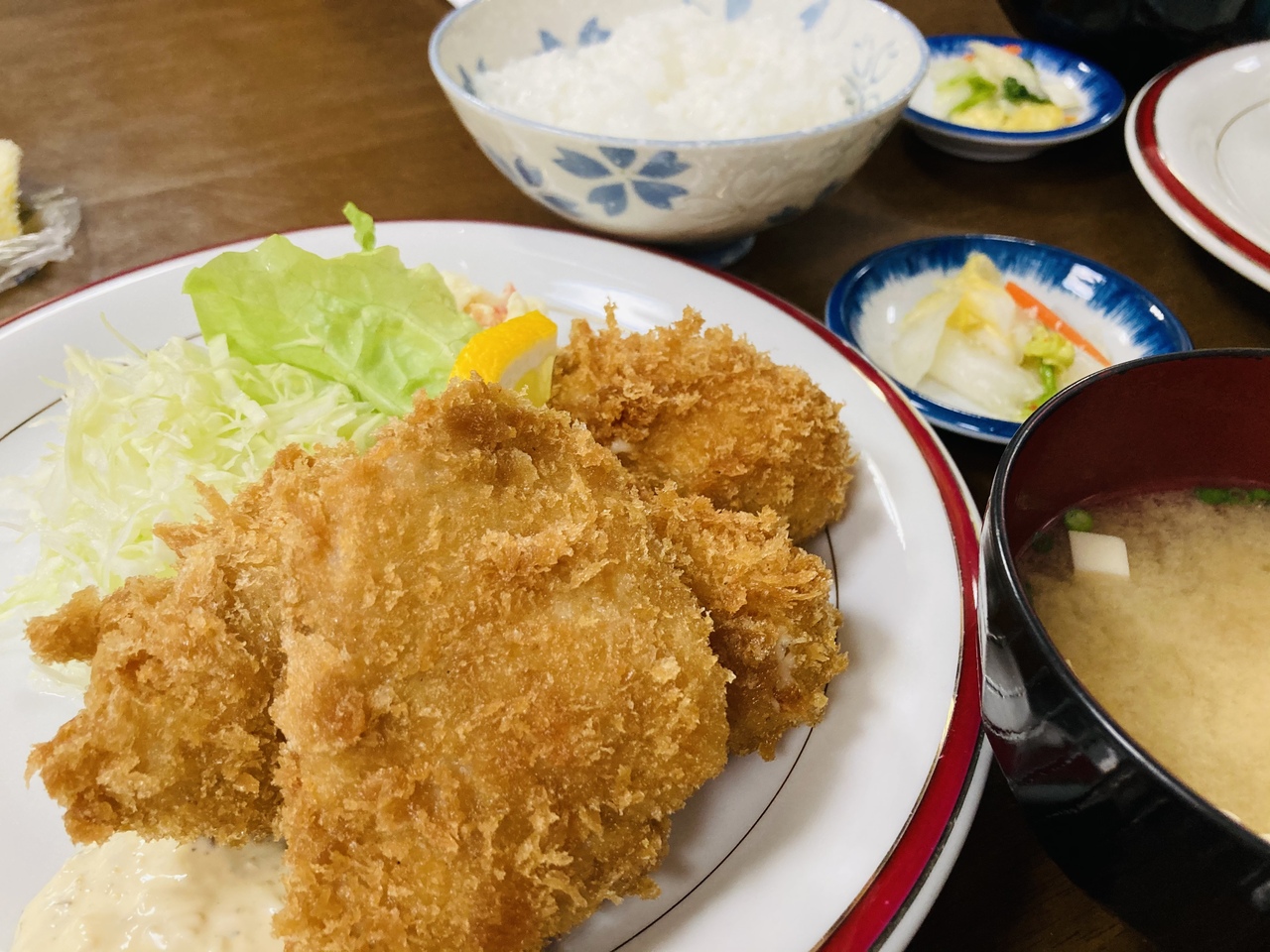 セット内容は、ご飯、カニクリームコロッケ2個、ホッケフライ2個、サラダ、漬物、味噌汁。