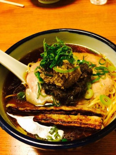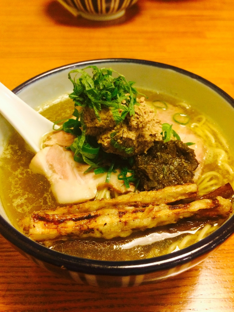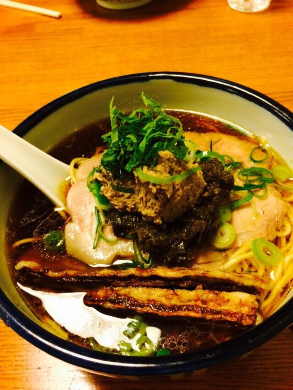 醤油、塩、味噌、辛味噌がありますが、白肝ペーストを溶きながら食べます。メンマの代わりに揚げたゴボウと煮たゴボウがはいっています。
