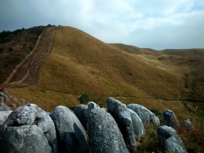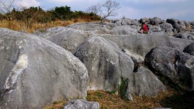 貫山登山道への通過地点。広大なカルスト台地を一望出来ますね。銀色に輝くススキの中の小道を歩いたり白い岩の間を歩いたりでずっと楽しみながら歩けます。遠くから見るのも良いですが自分の足で歩いて岩の形や大きさを確かめると楽しさ倍増です!