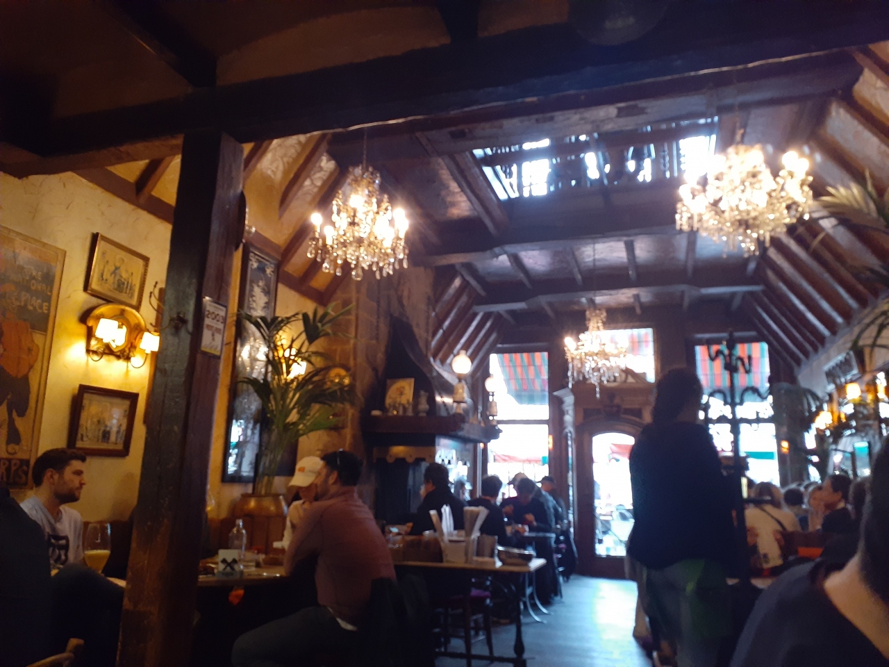 日曜日の昼過ぎに、小雨が降り続く中グラン=プラス周辺を歩き、ディナーまで時間があるので休憩がてらにと入店しました。店内はとても活気があり、満席のように見えましたが、スタッフが、一番奥の席を案内してくれました。店内はやや暗めの照明で装飾が素敵でした。私はホットチョコレートを頼みましたが、日本で飲む濃い目のココアのようで、美味しかったです。