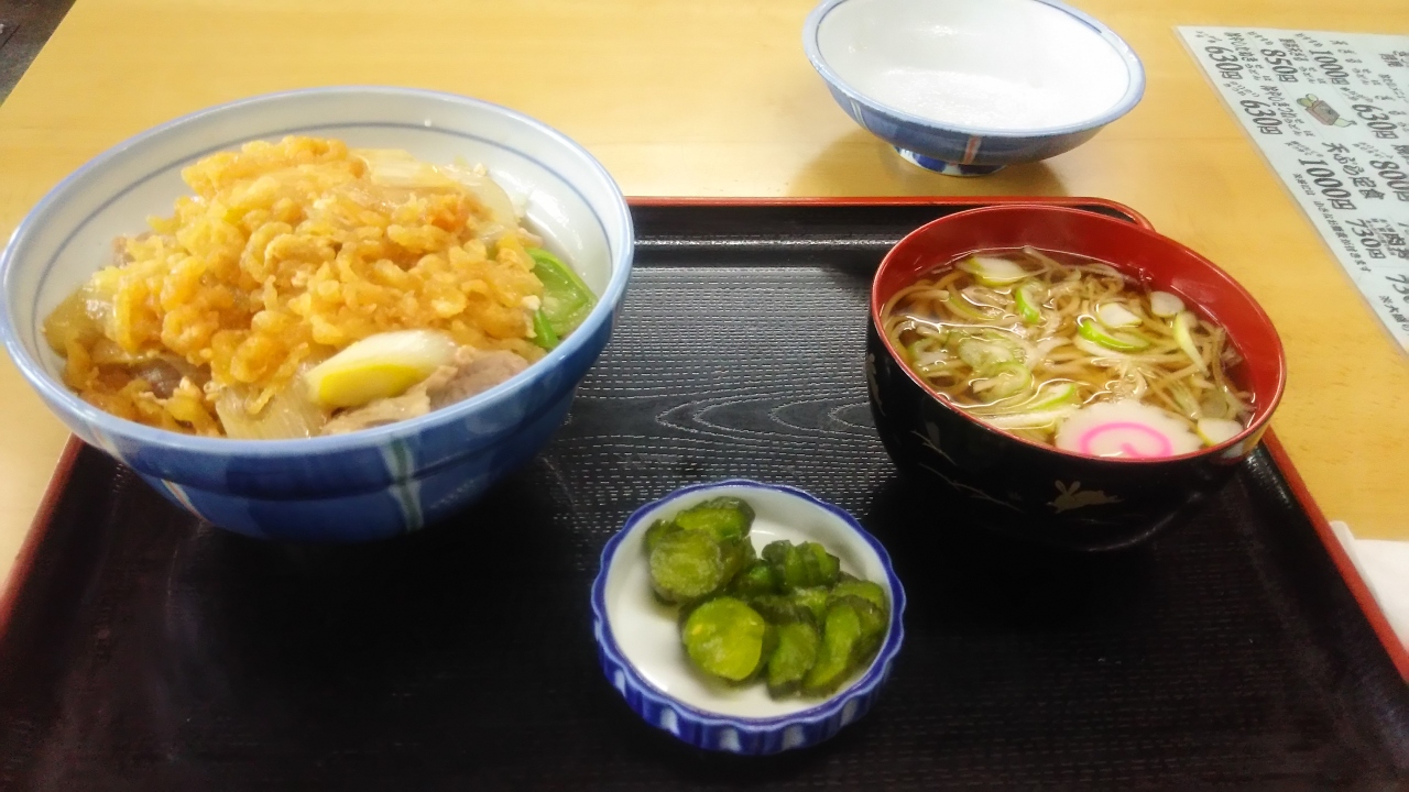 豚肉、天ぷらの衣、半熟玉子、ネギをがっつり食べられるどんぶりです。「東北の味」がしました。小さいお蕎麦も付いていてどんぶりとのバランスが良かったです。
