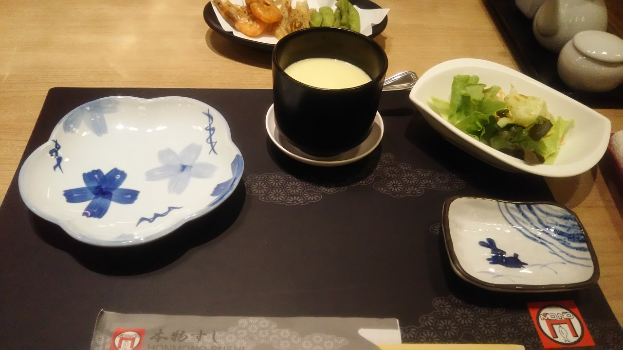 生寿司は高かったので天丼セットを頂きました。茶碗蒸しや枝豆など日本でおなじみの料理がメインの前に出てきました。日本と同じ味でした。天丼は海老2本とキス、かぼちゃ、イモなどボリューム満点です。タレは甘く感じました。デザートはメロン。お茶などは出ませんので有料のものを頼む必要があります。アイスの緑茶を注文した人はお代わり自由なようで何度も店員さんが注ぎに行っていました。接客は可もなく不可もなく。