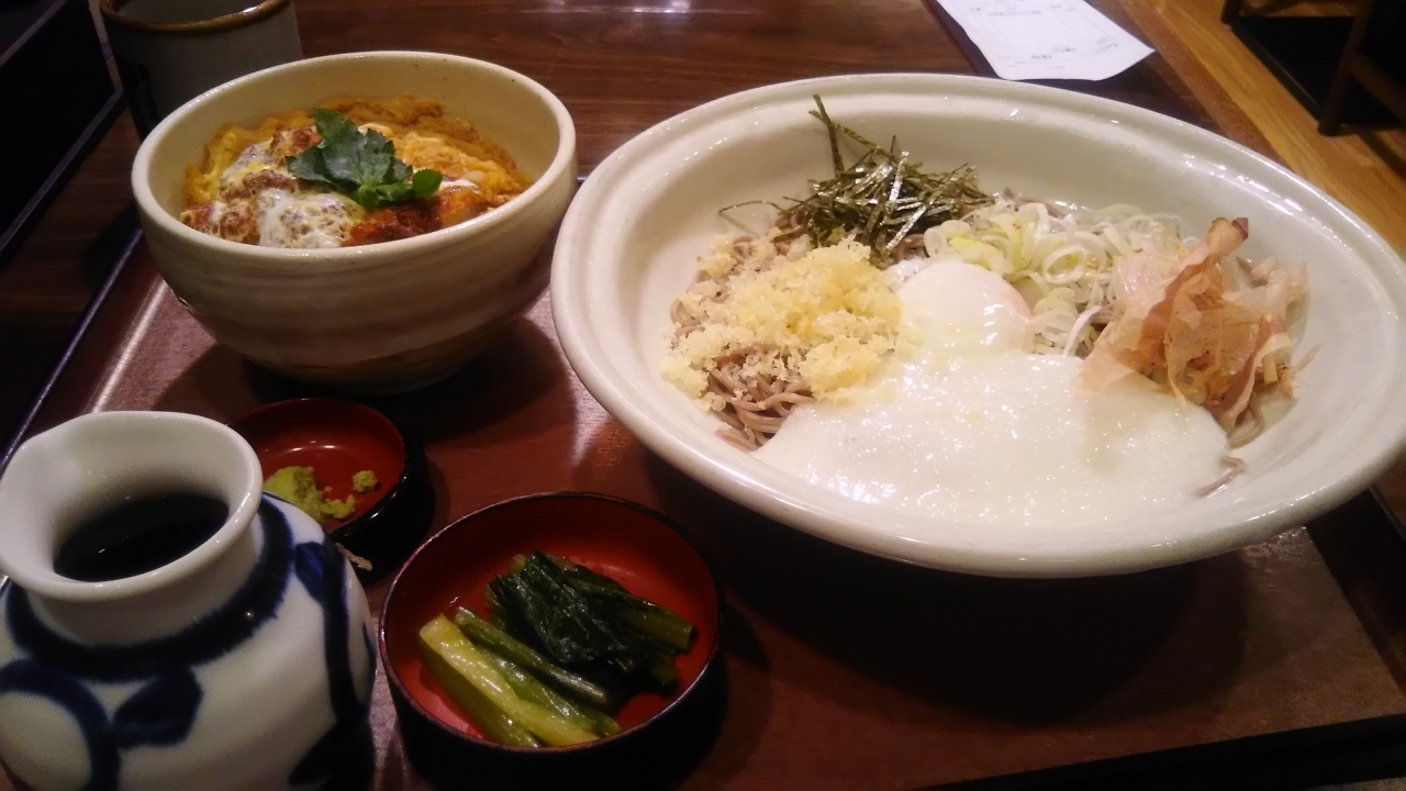 1000円ちょっとでそばとミニどんぶりのセットがいただけます。冷やし月見そばとかつ丼のセットを注文。