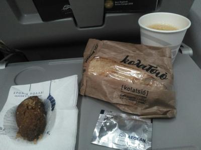 私のチケットはソフィアからアテネまで28.5ユーロとお手ごろでした。預け入れ荷物は含まれないものの、搭乗時はバゲットサンドとギリシャのクリスマスのお菓子、飲み物という軽食が出ました。モニターは上から出てきてどのあたりを飛んでいるのか確認できました。CAさんの制服と機体の塗装がシックな雰囲気を醸し出しており、なんとも優雅な気分になりました。
