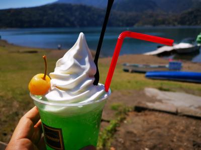 高千穂岳を望む御池の畔に出店を構える高原アイスクリーム研究所さん。