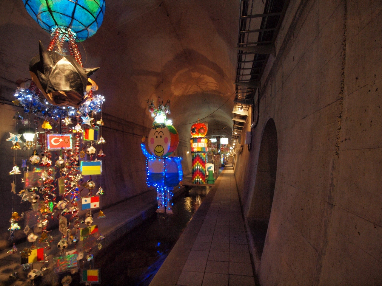500mくらいまで遊歩道になっており、中は良くわからない電飾のついた飾りが垂れ下がっています。行き止まりには湧水で工事が中止になったよってわかるように、水が沸いています。
