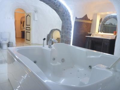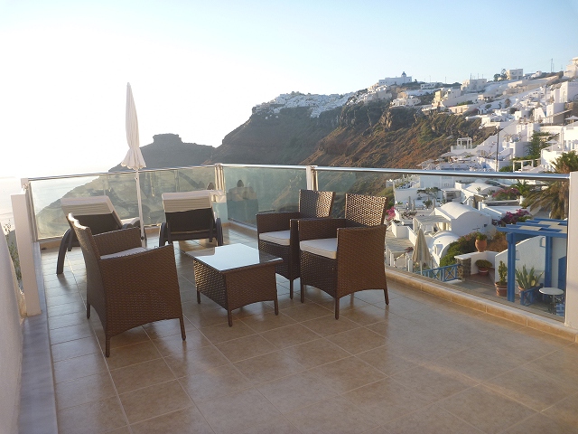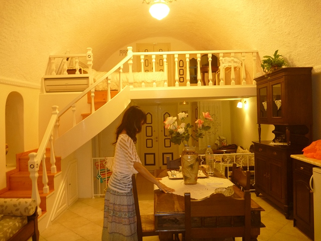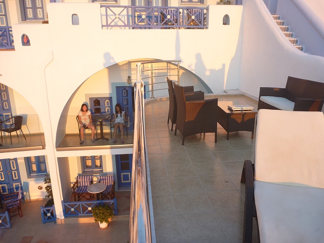 サントリニーでお世話になったのはAGNADEMAホテル。その素晴らしいスイートルームの内容は旅行記に載せました。すごいです! この可愛らしい外観がひときわ目を引く断崖絶壁の人気ホテル。僕らはこのホテルに一部屋だけあるスイートに3泊しました。景観はオーシャンビュー、夜景が見えるCityビュー、プールが綺麗なガーデンビューのすべて。お部屋は前室、リビング、天蓋のある主寝室、ロフトになってる第2寝室、リビングよりも大きなバスルーム(笑)と大人2人が足を延ばして楽々入れるジェットバス、第2バスルーム、1F玄関外のくつろぎスペース、ロフトから外にでられるプライベートバルコニー、3Fにあるプライベートガーデン(リッチなバルコニー)です。プールまで部屋から5歩ですv(^^)v