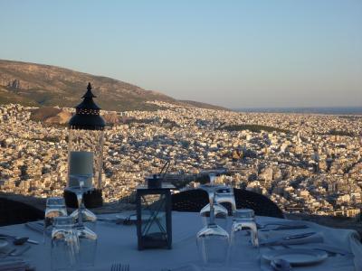 アテネ一高い、リカヴィトスの丘にあるこのレストラン。予約必須ですが、絶景を味わえます。人口500万人を超える真っ白なアテネの街が夕焼けに赤く染まり、アクロポリスの丘のパルテノン神殿が眼下に見えます。また、遠くにエーゲ海や島々が見え、最高の雰囲気でおいしい食事を味わえます。中学生と小学生の娘を連れて行きましたが、素敵な夜をすごせました。服装は私はジャケット+革靴、娘と妻はミュールと綺麗目のワンピースです。店内では女性はドレスアップしている方もいらっしゃいましたが、男性はそこまでではなく、われわれも特に浮くことなく、食事を楽しめました。おすすめです!