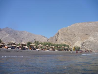 ペリッサビーチは古代ティラの麓にあります。レンタカーを借りていくことをオススメします。近くには無料駐車場がたくさんありますので、停め場所には苦労しません。ビーチはよく整備されていて、パラソルやビーチベッドを7ユーロで借りれます。海の家では各種飲み物、食べ物を提供しています。ビーチに行くまでの間に、スーパーもたくさんありますので、そこでポテチなどおつまみを買っていけます。カマリビーチより、海が綺麗です。