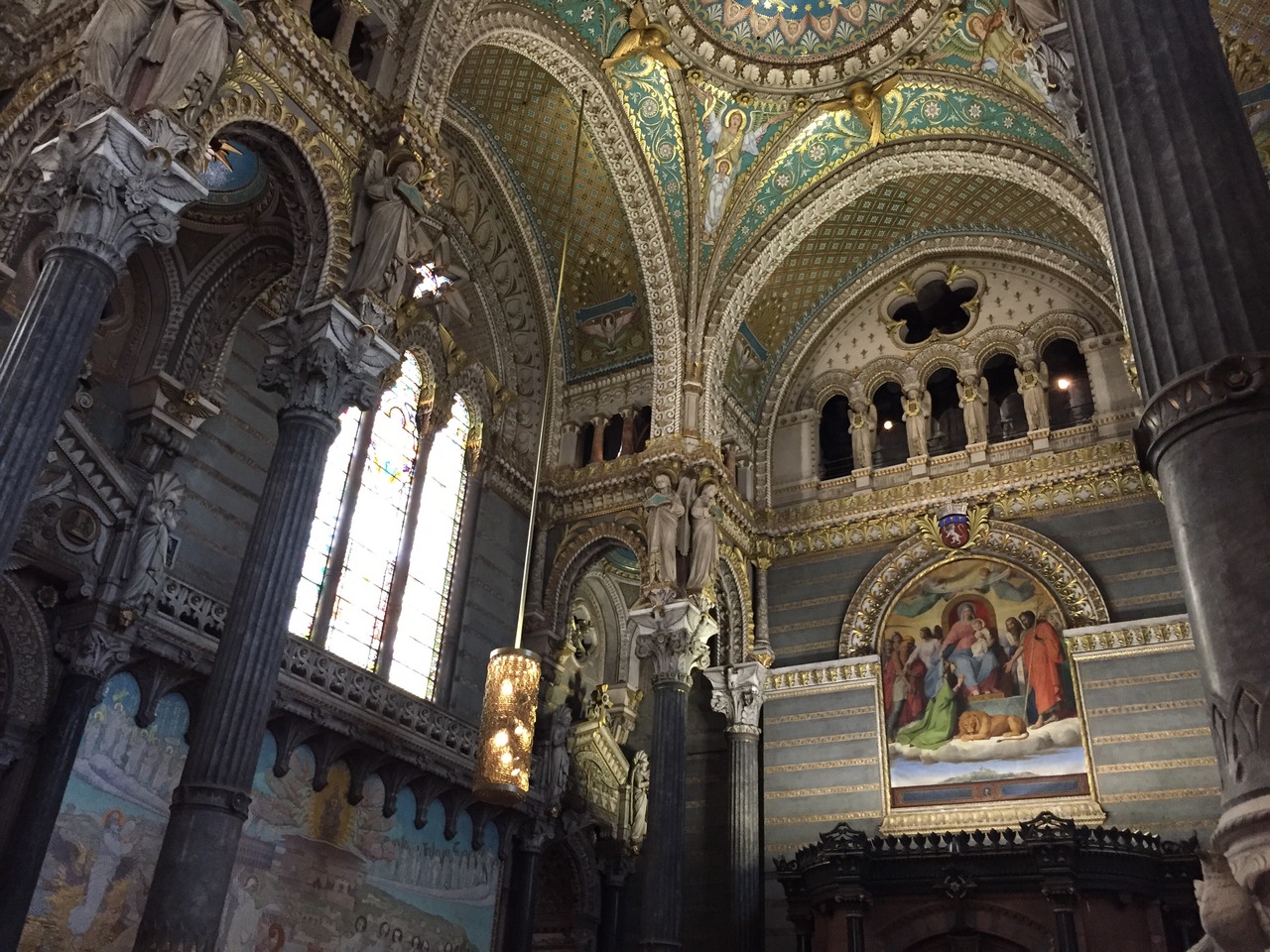 リヨンを象徴する教会です。内装は他のフランスの教会と同じで、座席の周りに像やろうそくなどの祈祷のための場所があり、窓にはステンドグラスが嵌められています。時々英語のツアーもあるようですので、是非下調べして参加してみて下さい。