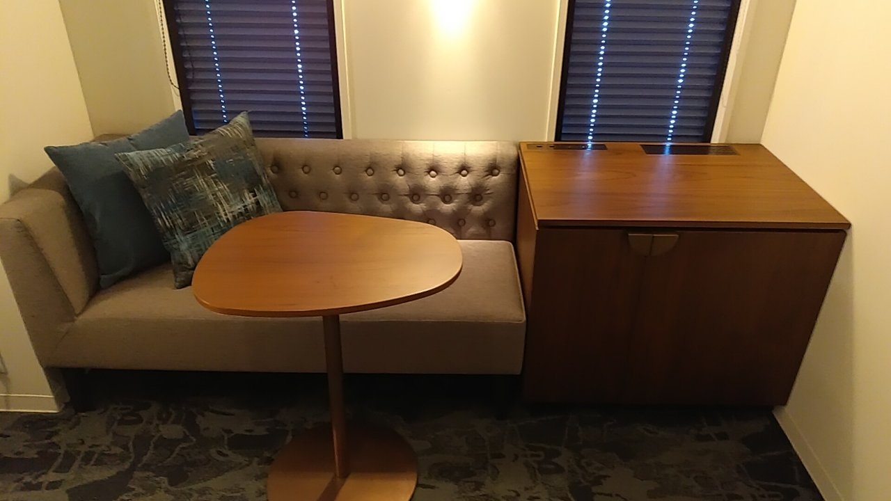 今回は宿泊では無く、10時~18時利用可能なテレワークプランでした。部屋にはベッドは無く、仕事しやすいデスクが置いてあります。休憩用にソファもありますので、疲れたらコーヒーのみながらゆっくりできます。