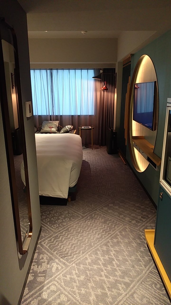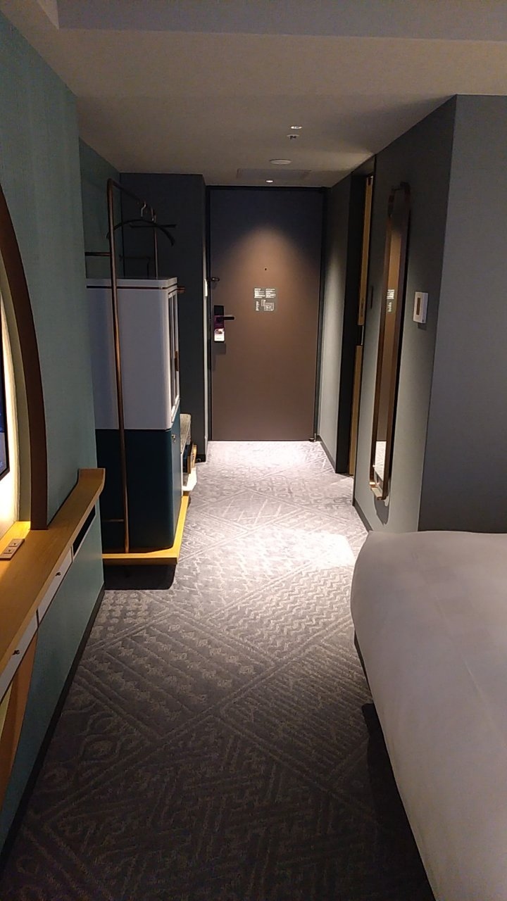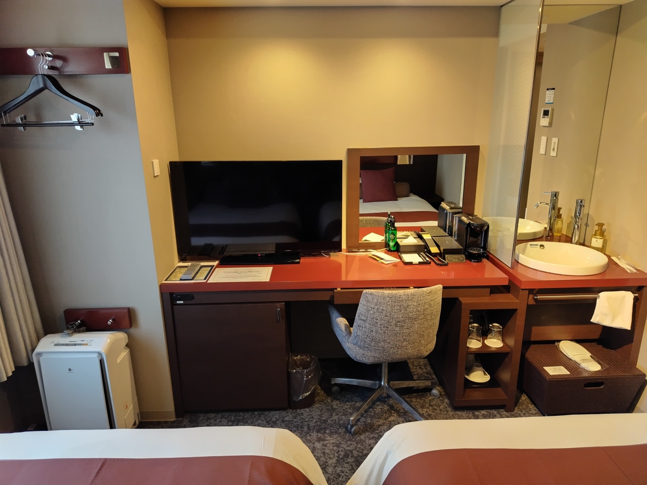 部屋は20平米とかなり広めのプレミアムダブルです。仕事するには広めの部屋の方がストレスがたまらないので、嬉しいですね。部屋のわりにデスクが狭いのが少し気になる所です。