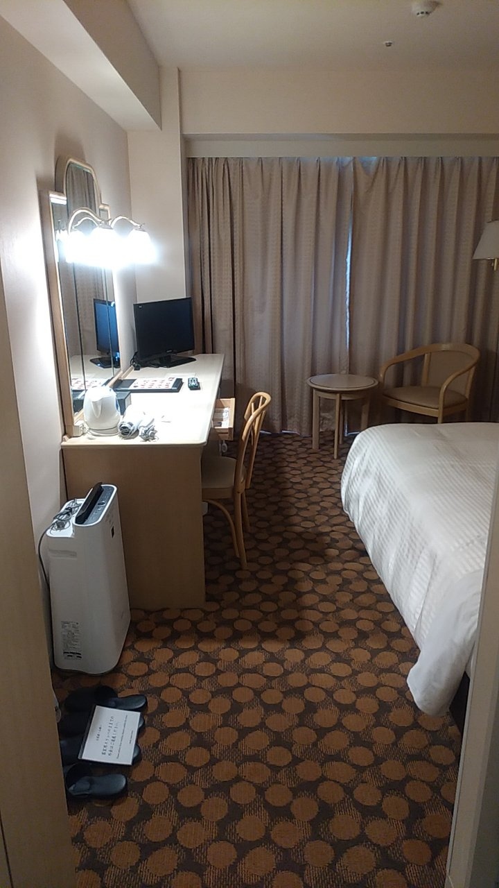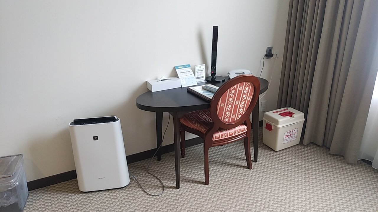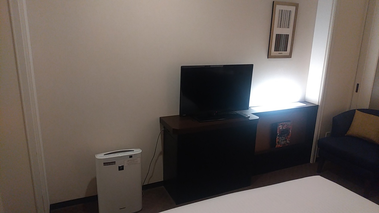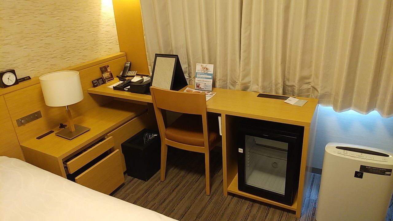 禁煙シングルで予約していましたが、ツインルームに変更になっていました。デスクが広いのでビジネス利用にはありがたいです。ミネラルウォーターが1本サービスで部屋に置いてあります。加湿付き空気清浄機もありますので、不足している備品は特にありません。