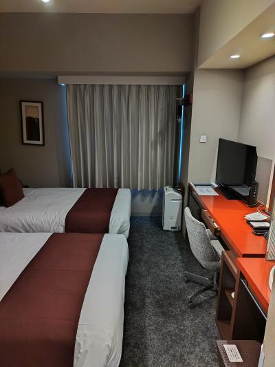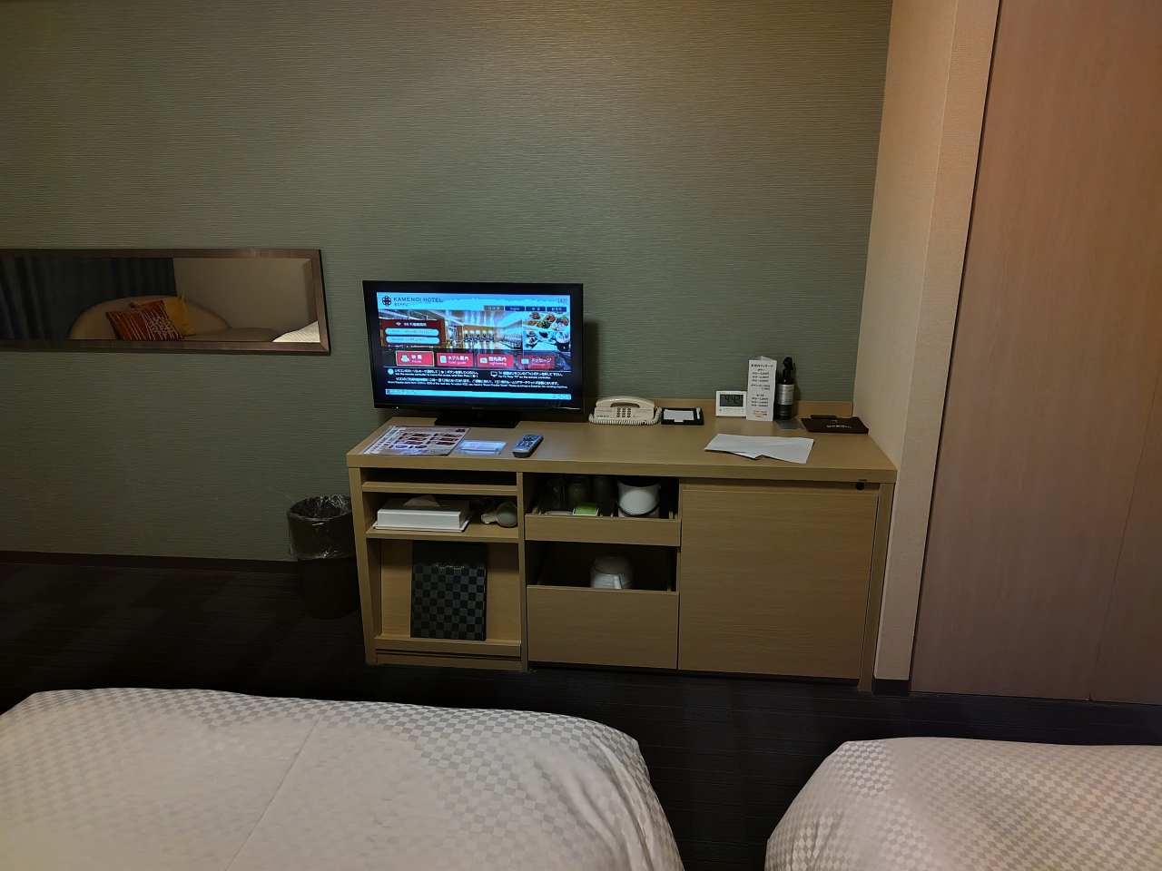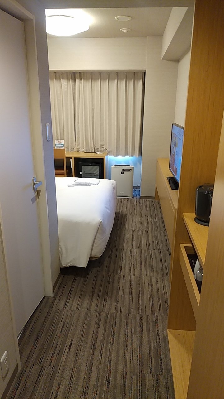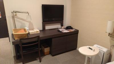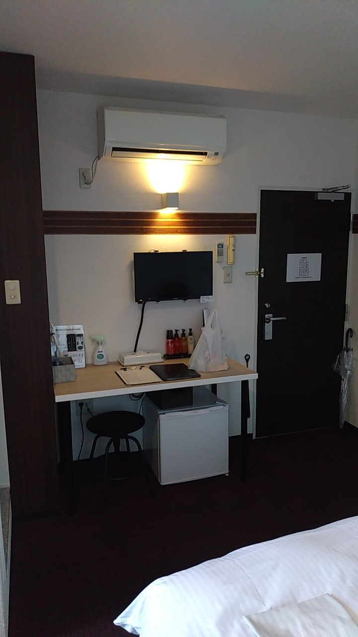 禁煙シングルで予約していましたが、ツインルームに変更になっていました。デスクが広いのでビジネス利用にはありがたいです。ミネラルウォーターが1本サービスで部屋に置いてあります。加湿付き空気清浄機もありますので、不足している備品は特にありません。