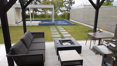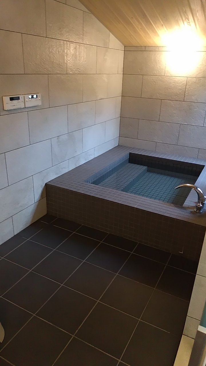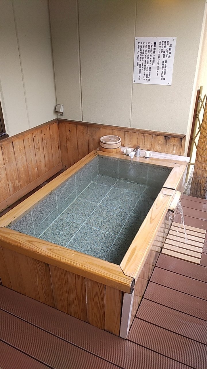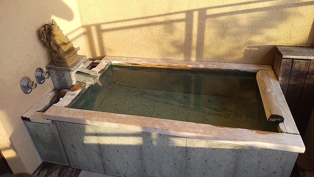 お風呂は温泉です。室内の浴室と庭にジャグジー露天風呂があります。到着して早速ジャグジー露天風呂に入りました。