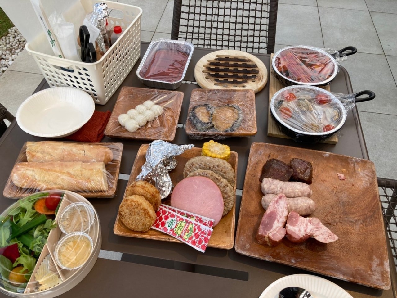 晩御飯はテラスでバーベキューです。食材はホテルの方が持ってきてくれます。子供たちは初めての屋外バーベキューを楽しんだようです。