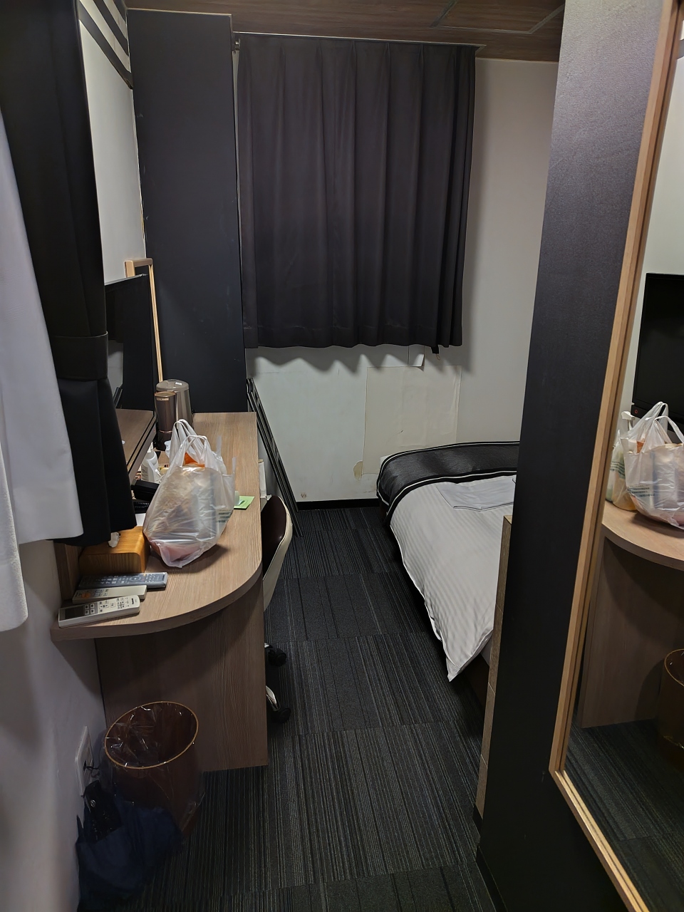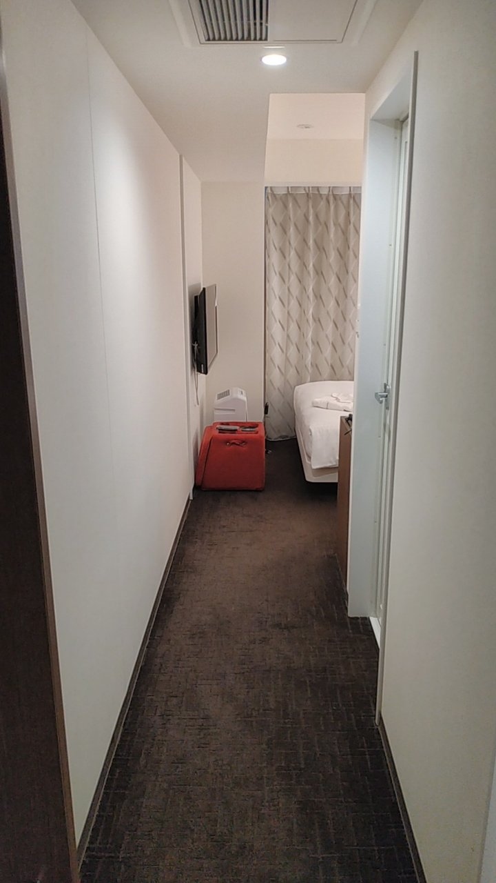 部屋は16.5平米のセミダブルです。東京のホテルは部屋が狭いことが多いですが、新宿区にありながら16.5平米は驚きです。デスクも広くてビジネス利用にも充分です。トランクも部屋の中で広げたままで邪魔になりません。