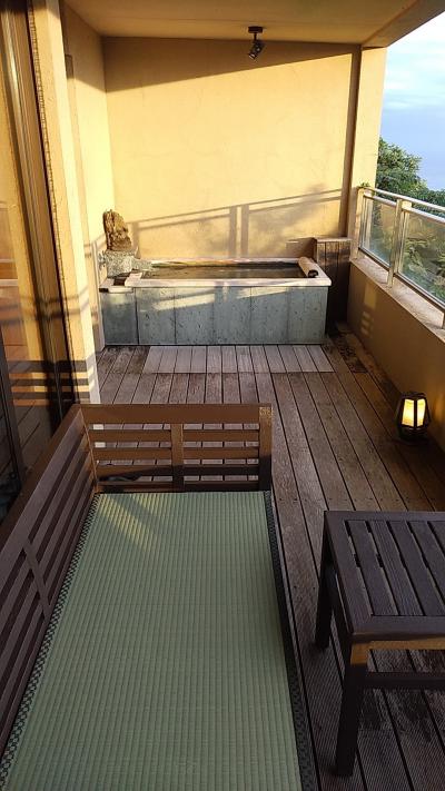 部屋に着くなりすぐに露天風呂へ。夕焼けと海を見ながら入る温泉は最高です。子供達も喜んで一緒に入りました。少々熱めだったので水を足しました。