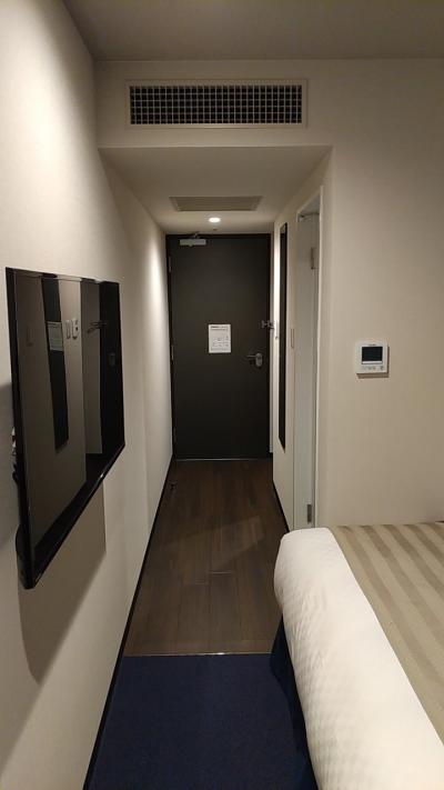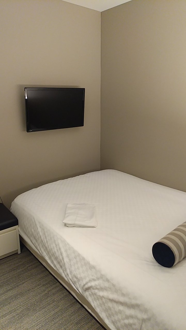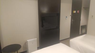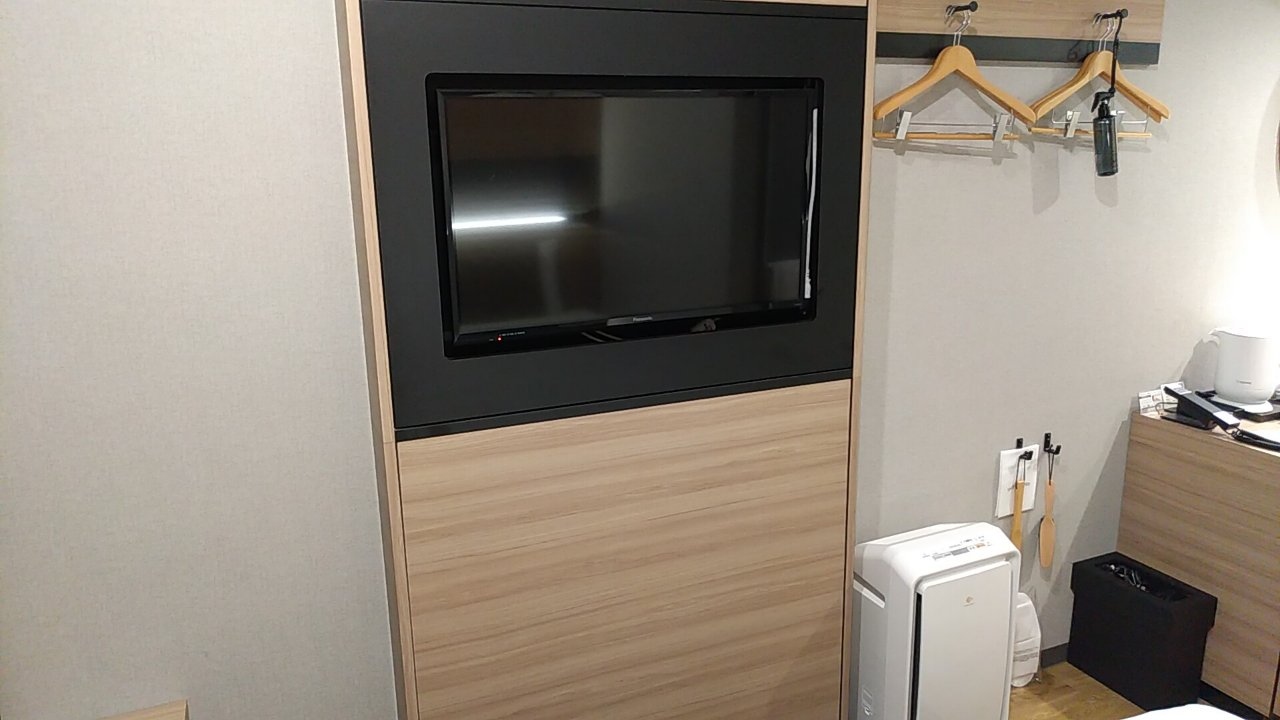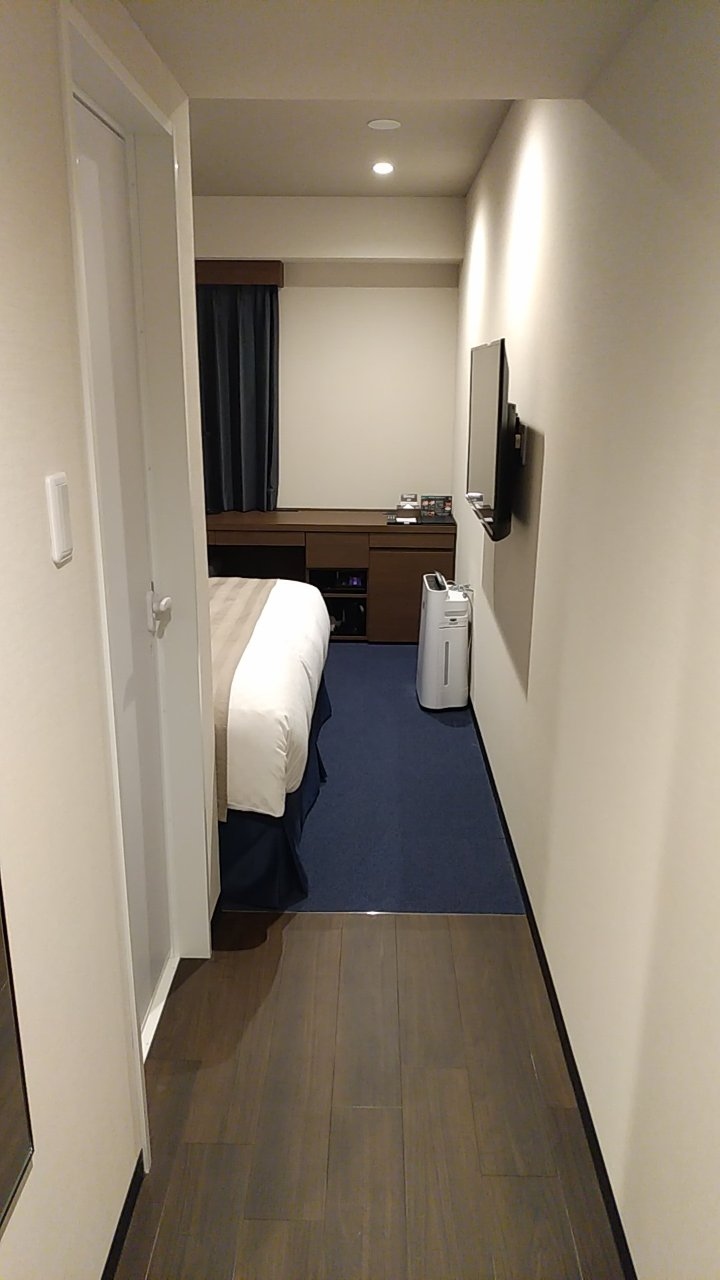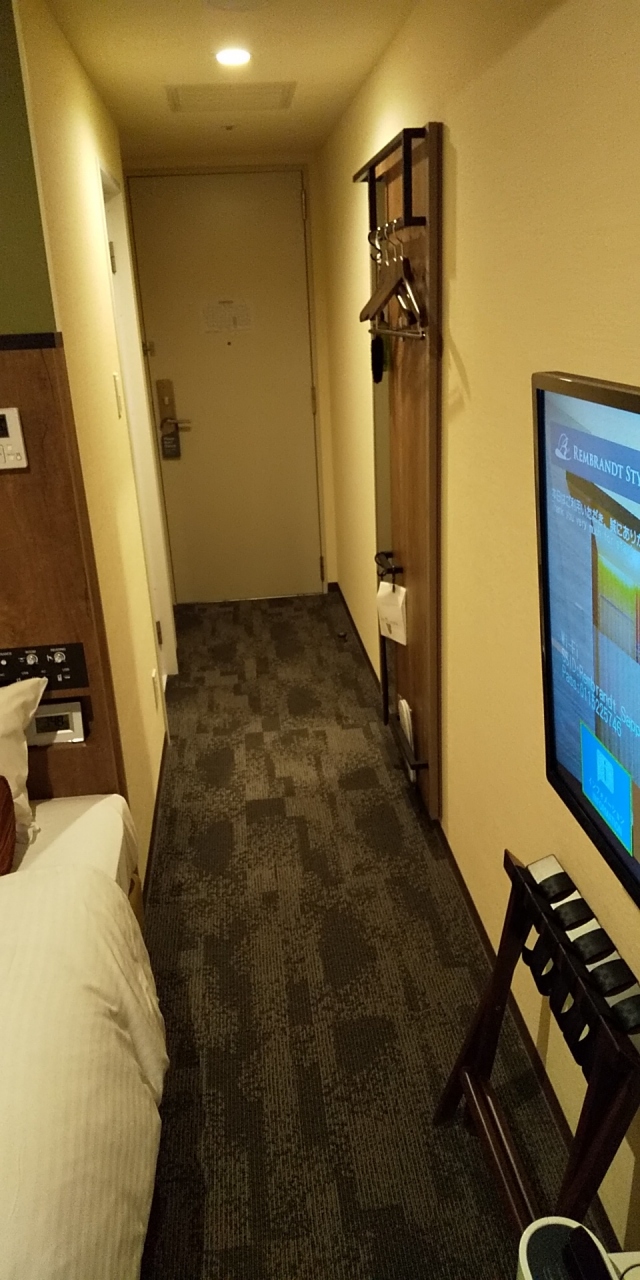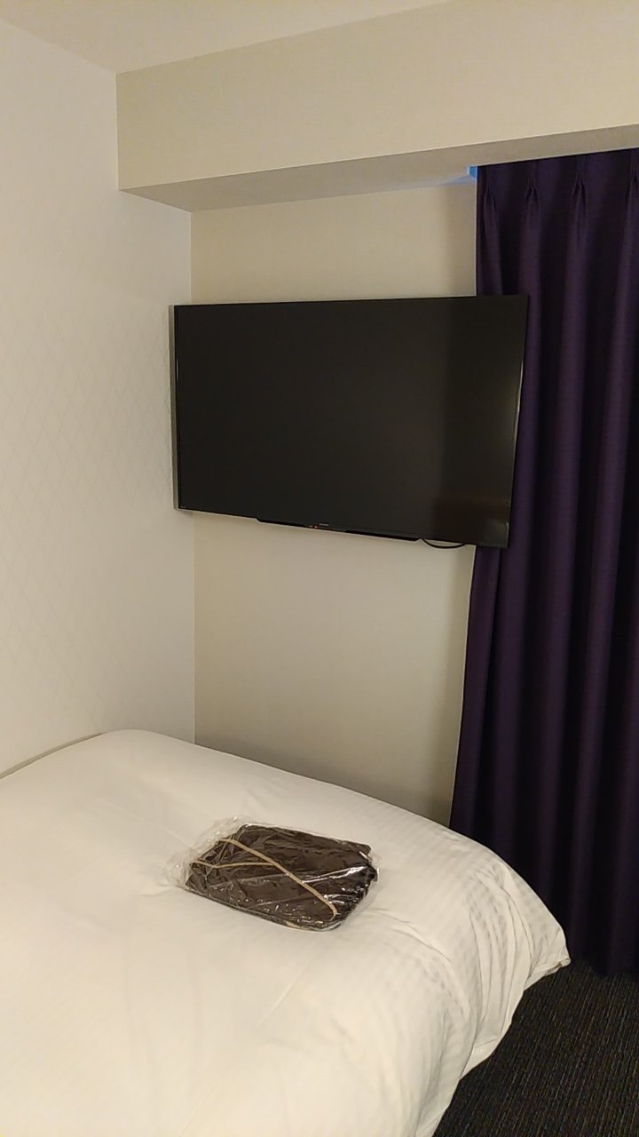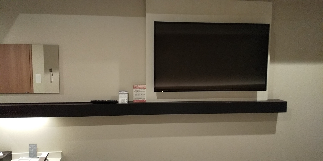 部屋はシングルです。アパホテルなので部屋はかなりコンパクトです。その割に壁掛けのテレビはかなり大きいです。