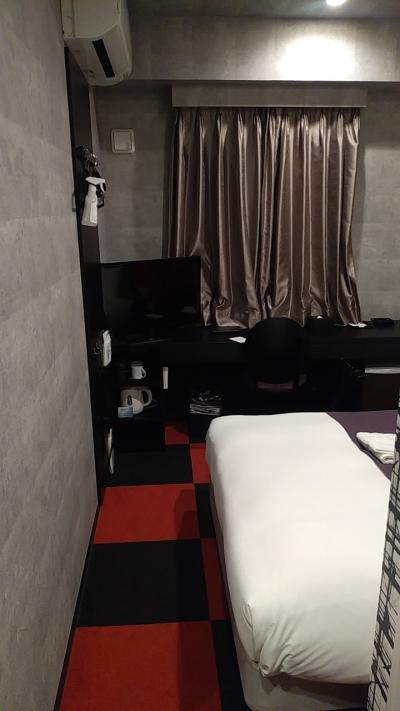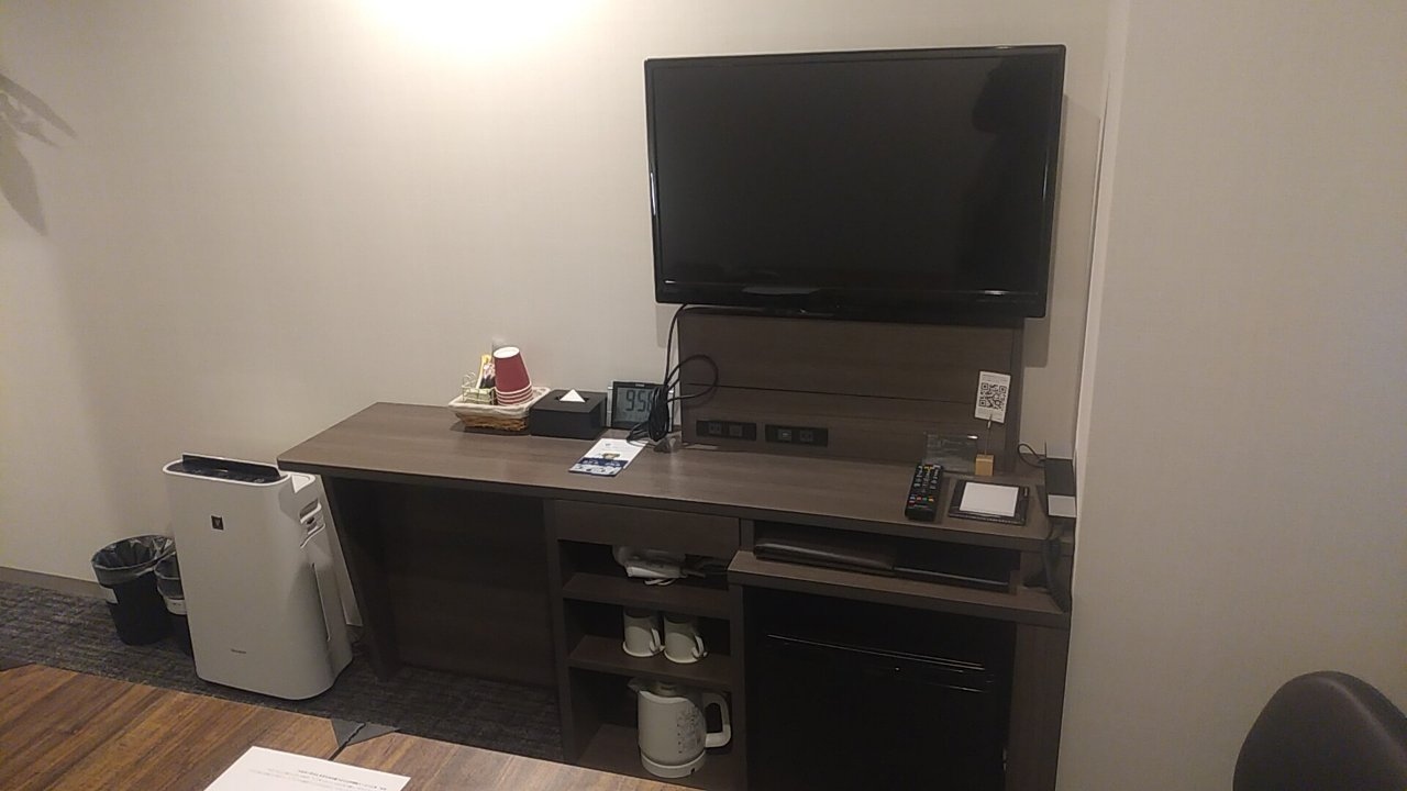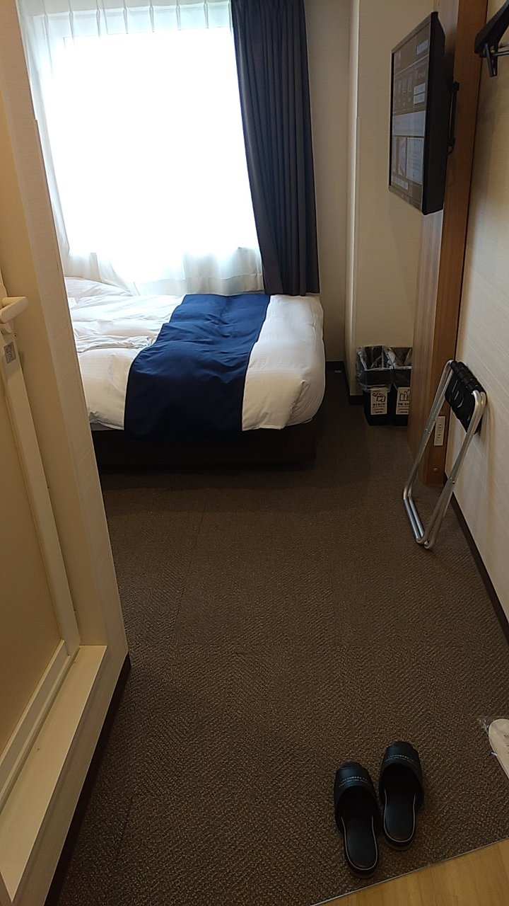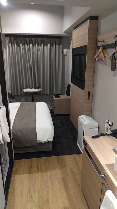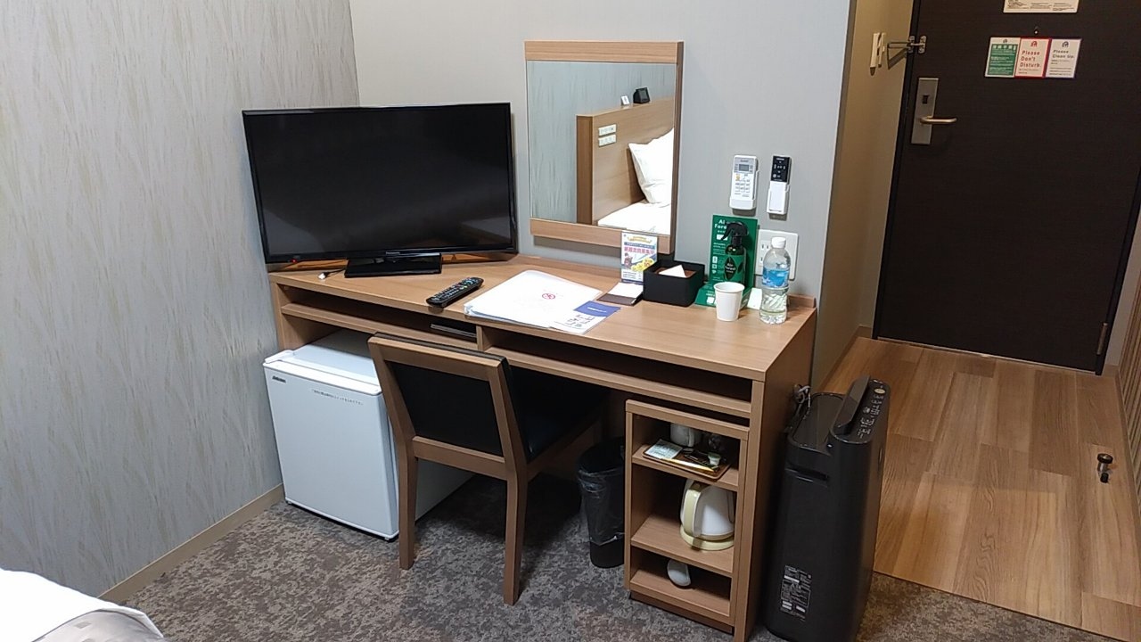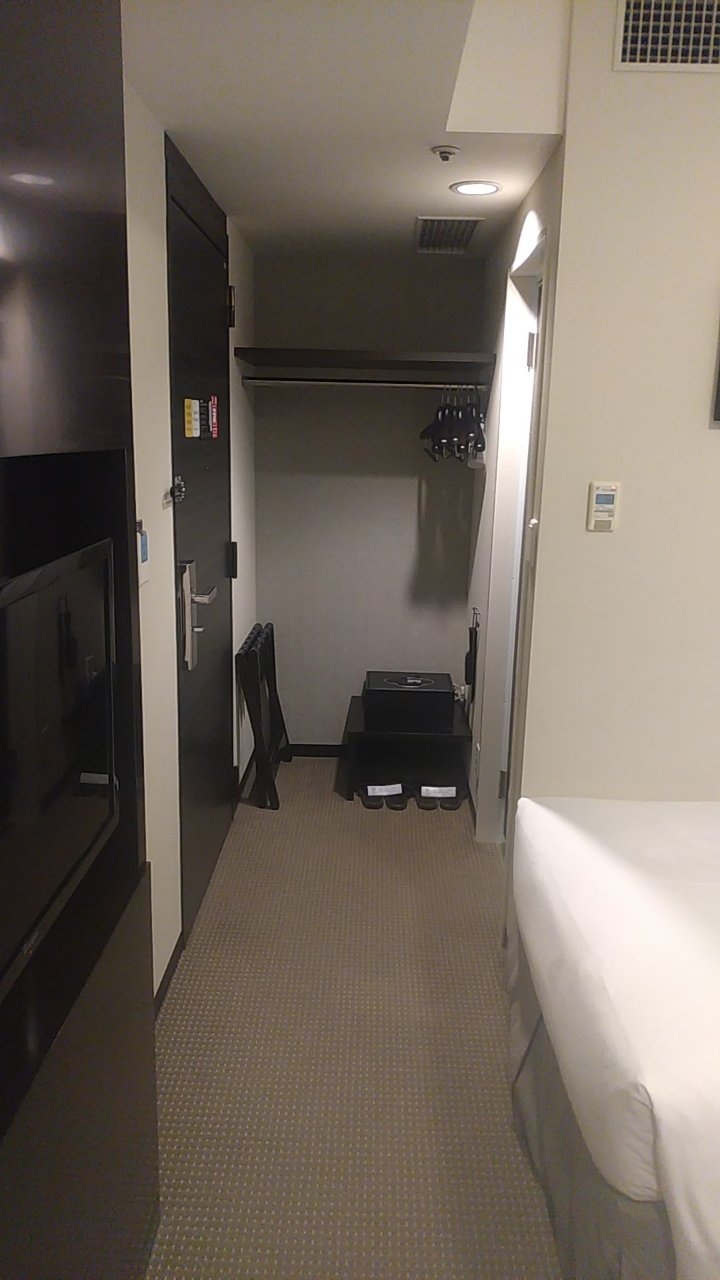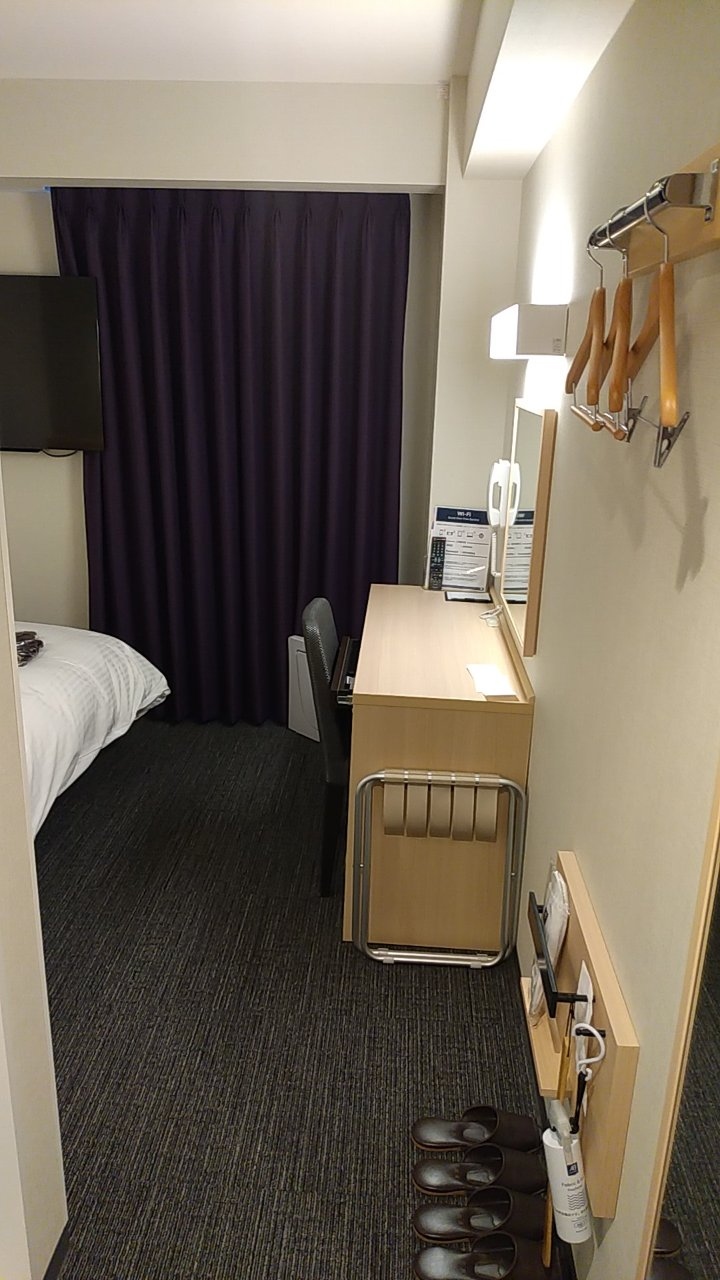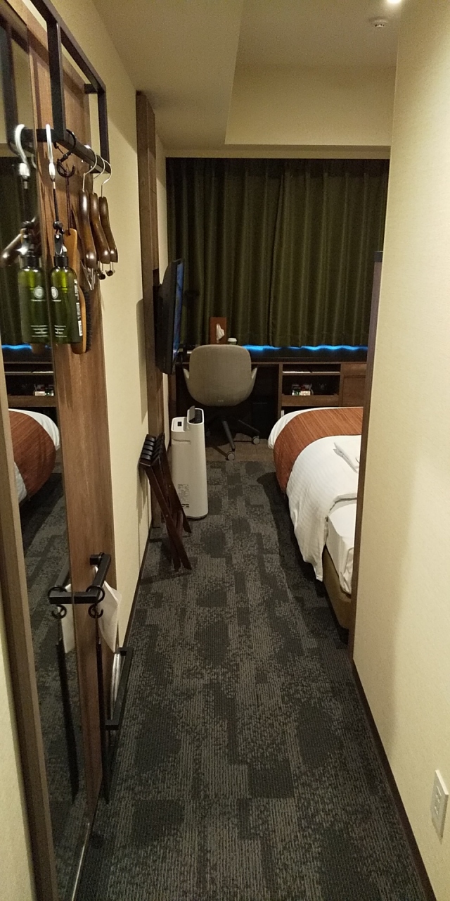 部屋はシングルです。アパホテルなので部屋はかなりコンパクトです。その割に壁掛けのテレビはかなり大きいです。