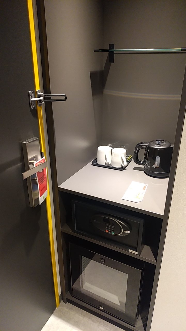 部屋は普通のシングルルームです。今回はベッド使用不可ですので、仕事に疲れてベッドに横になることはできませんでした。ベッド以外は利用可能です。フロント横にコーヒーやお茶が置いてあり飲み放題です。またチェックイン時にミネラルウォーター1本くれました。