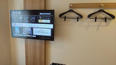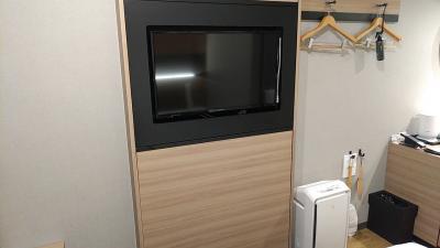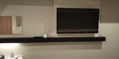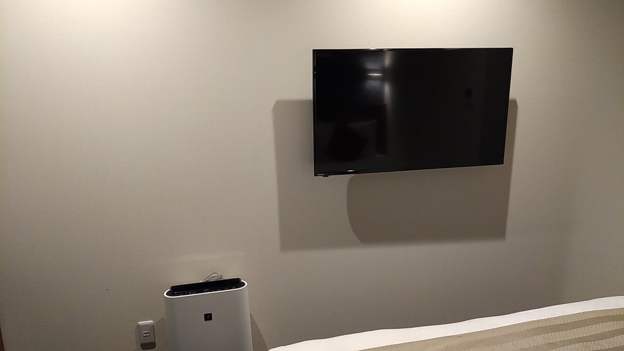 テレビは壁掛け式です。ベッドに寝転んで見るのがベストな位置です。部屋の割にテレビが大きいので、少々圧迫感がありました。