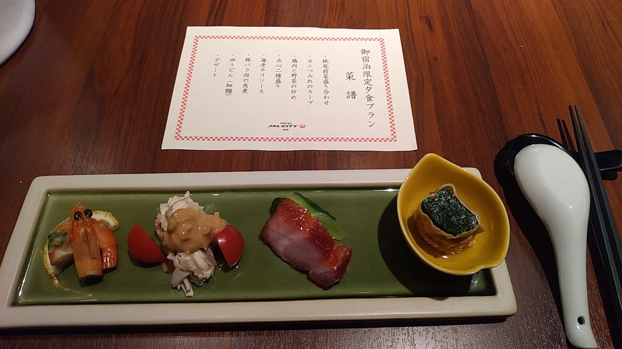 夕食はホテル2Fにある中華料理店桃苑です。中華のコース料理でした。メニューは画像をご覧ください。それ程量は多くありませんが、味は満足です。