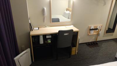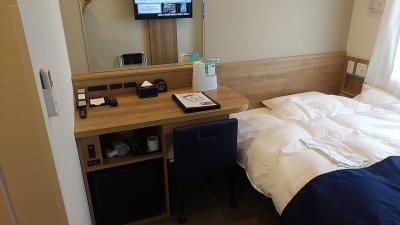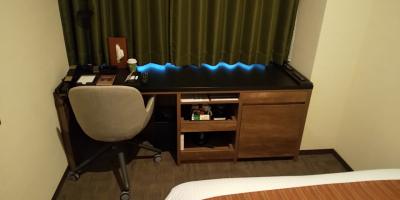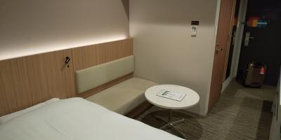 部屋サイズは12.8平米とコンパクトですが、ベッド幅が120cmということもあり、それほど狭さは感じませんでした。デスク幅も仕事するには問題ないくらいのサイズです。電源コンセントは机上2個口とデスク左側2個口あります。Wi-Fi接続もスムーズでした。