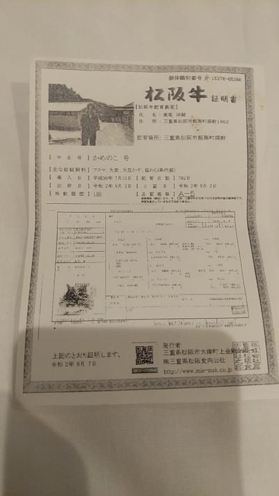 松阪牛の証明書のコピーもくれます。- 旅行時期