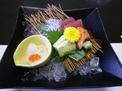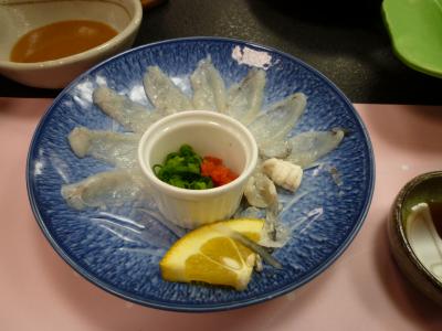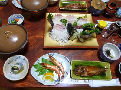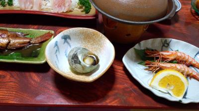 晩御飯は写真の通り大盛りの鯛の刺身、金目鯛の煮つけ、エビ、サザエ、ホタテ等魚介類のオンパレードです。肉は全くありませんでした。普段これほど魚介類を食べることがないので、ついついご飯も茶碗3杯食べてしまいました。料理は美味しくて満足です。