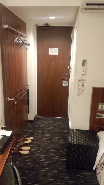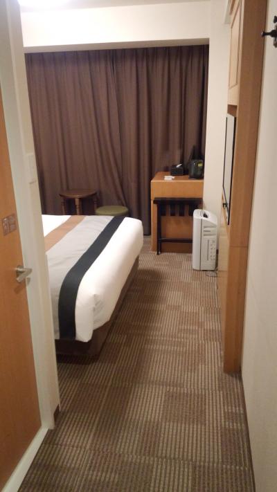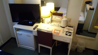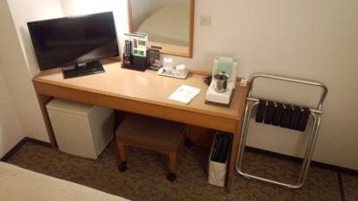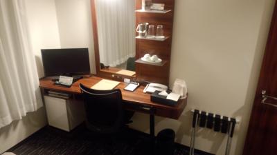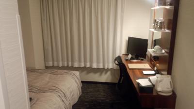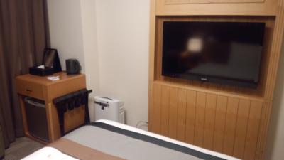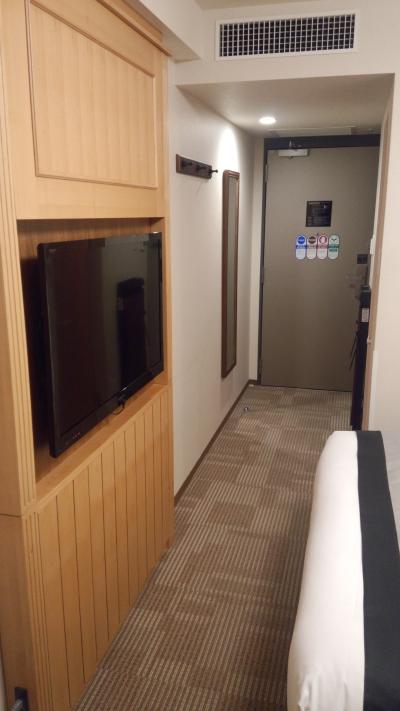 都内のシングルルームではかなり広めでゆったりです。ベッドも150cmくらいでしょうか、大きい印象です。テレビはおそらく37型で壁掛け。ベッドに寝転んだ時丁度正面で見やすくなっています。
