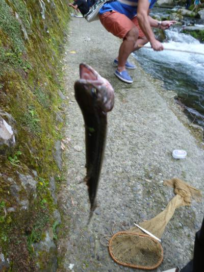 渓流なので釣り堀と違って簡単には釣れません。こちらから見える魚は、魚からも人間が見えているので餌に食いつきません。狙い目は流れで白くなっている所や岩場の影とのことです。