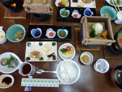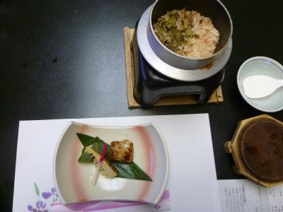 晩御飯は部屋に懐石スタイルで持ってきてくれます。お造り、お肉、焼き魚、煮物と釜めしが出ました。お造りは脂が乗ってプリプリ、全体的にとても美味しかったです。