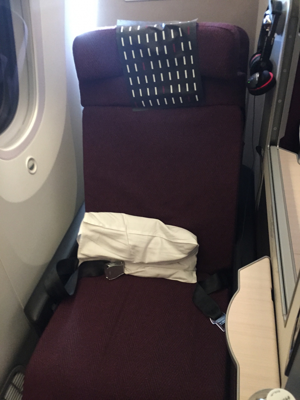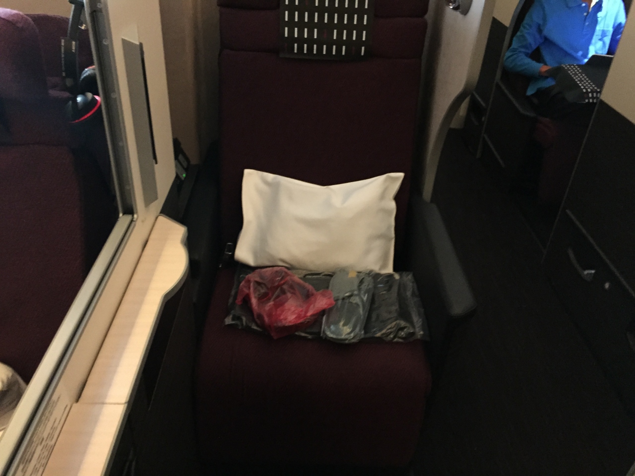 窓側の座席はプライベート感があり、フルフラットでの幅も広く使え快適でした。
