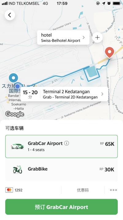 日本からの直行便の発着便のあるスカルノハッタ空港T3ではGrabの乗り場は空港有料駐車場内にあるために空港乗り入れ料金と駐車料金が加算されるのでタクシーの正規料金よりも若干割高になってしまう。