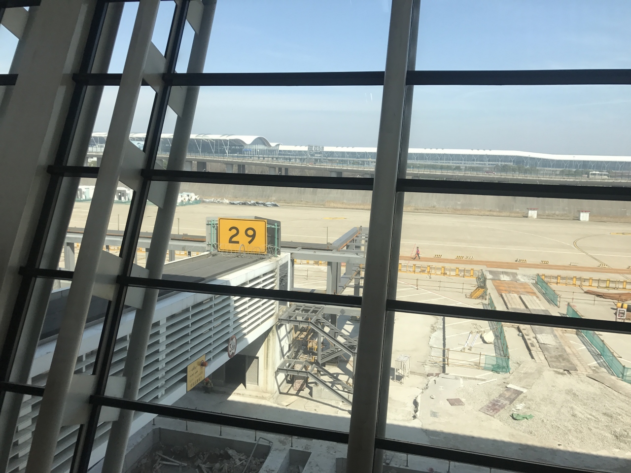 現在浦東空港国際線第1ターミナルでは滑走路反対側の搭乗ゲートが工事中の為、ボーディングブリッジの数がかなり不足した状態になっている。