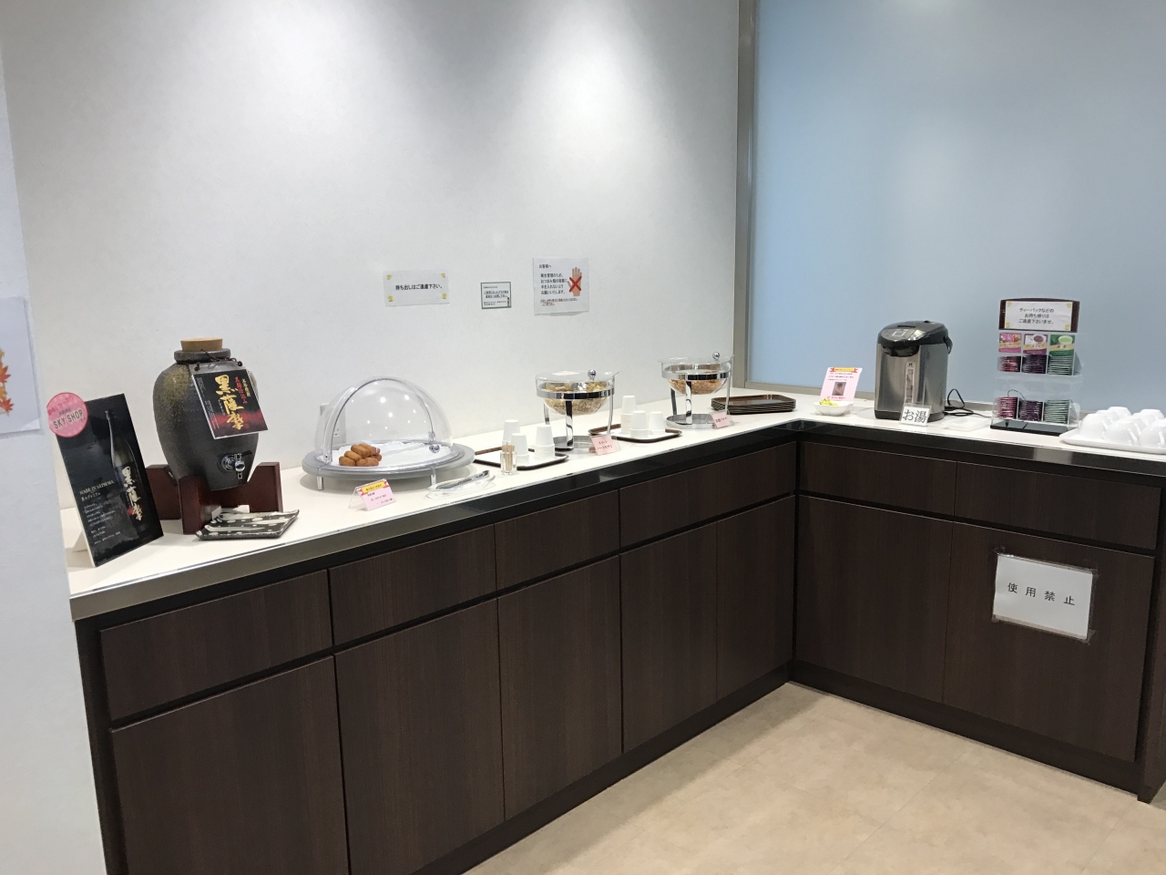 無料の温冷茶、コーヒーサーバーがあるが一台しかなくここだけは混み合っていた。- 旅行時期