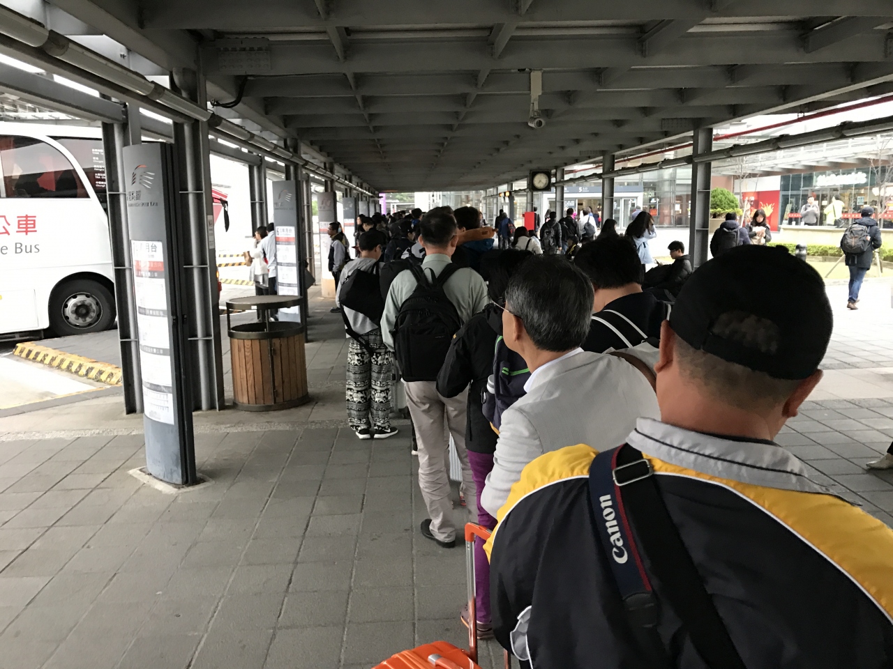 桃園駅までは快適に移動できるものの、駅から空港のシャトルバスが長い列。