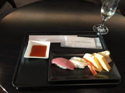 成田JAL本館ファーストクラスラウンジのSUSHI BARで職人さんが目の前で握ってくれる握り寿司は逸品です。
