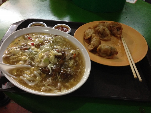 夕食に行ったときは北京河粉(餡かけライスヌードル)と揚餃子を頂きました。