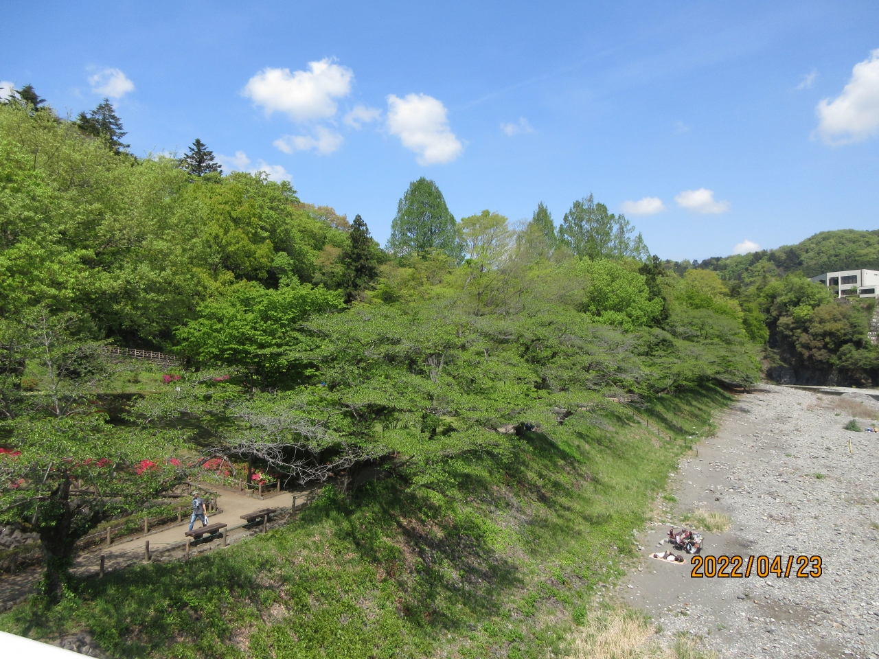 多摩川沿いにある「釜の淵公園」は緑が多く、広々とした自然な景観がつくる、恵まれた環境にある。今は多摩川の流れも細く、川原の方が広い。