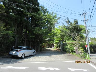 燈々庵の正面入口、茅葺(かやぶき)の門に至ると、その左に30mほどさらに進むと、お店専用の駐車場があった。十分過ぎる広さの駐車場に3台ほどが停まっていた。
