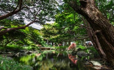 大正時代から保存が続く「松岡庭園」は四季折々の姿を見せて、園内の松やつつじの樹木は樹齢百余年を数えると云う。