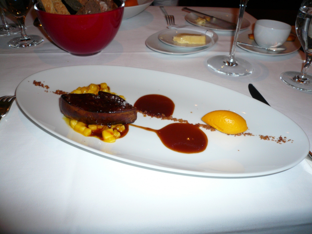 前菜:私は鵞鳥のレバーロースト、2種類のタイ-マンゴ添え。